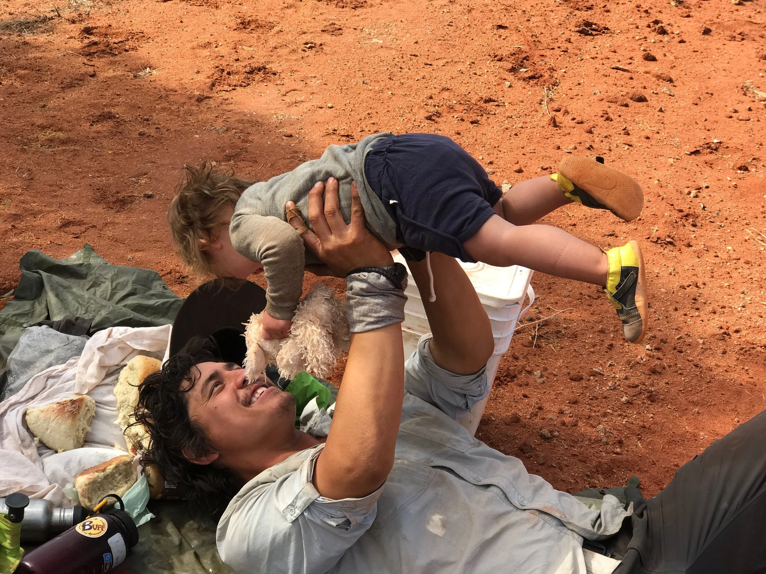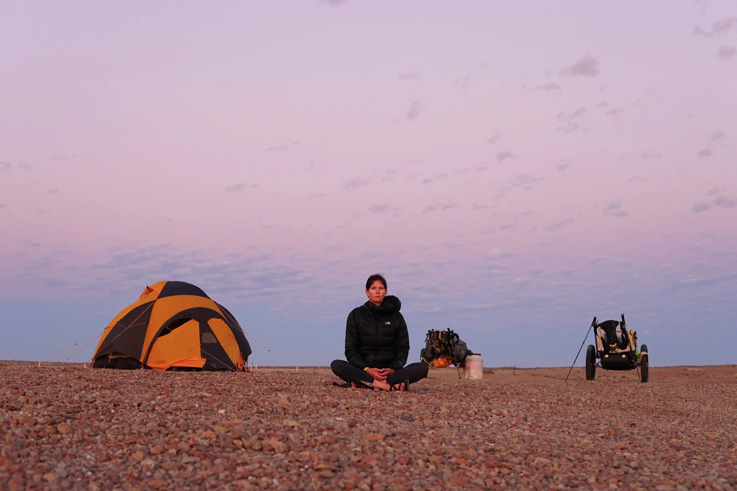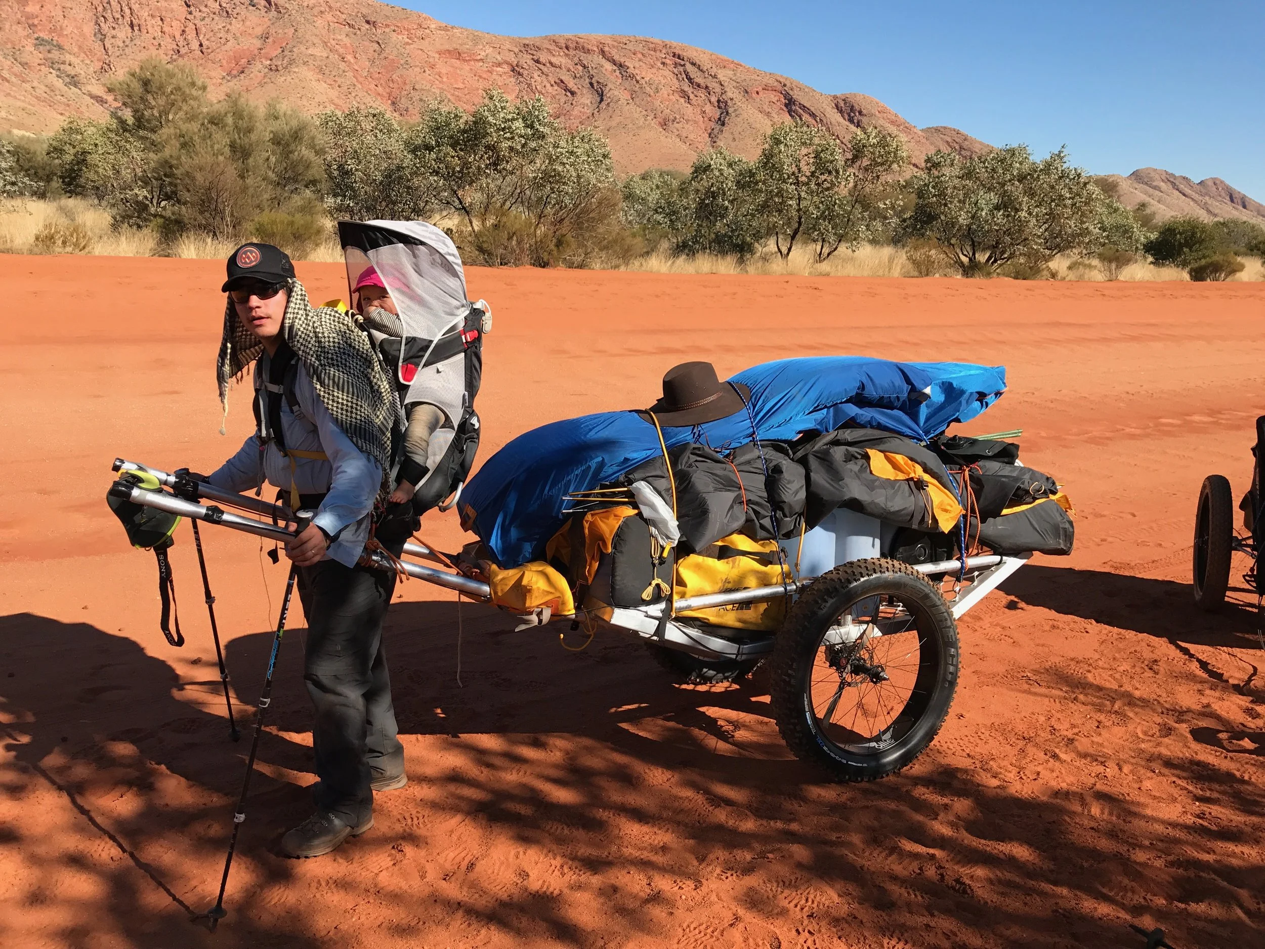 Together they would trek 1,800 kilometres unsupported , halfway across Australia, through the Out- back, with their one year old Morgan. Over 102 days they battled extreme temperatures, vast iso- lation, sleep deprivation (thank you teething), suffocating flies, dehydration, crippling blisters, sore ankles, dodged snakes, dingos, emus, kangaroos and wild brumbies.